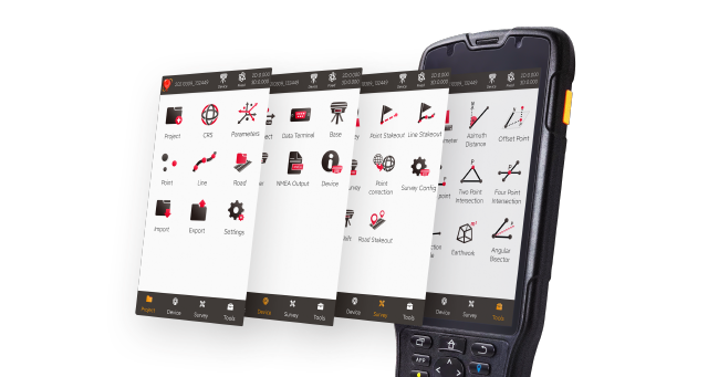Funções de survey: Coleta estática, rover e base, Stakeout CAD, Earthwork, Road stakeout, COGO: área, perímetro, azimute/distância, stakeout com confirmação